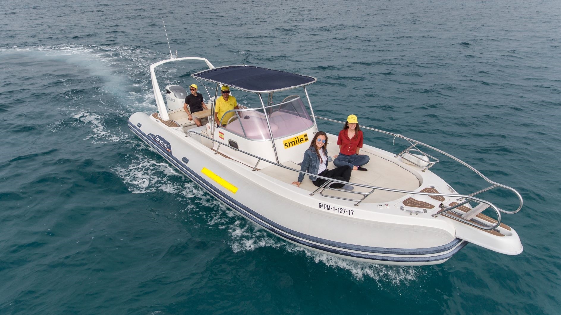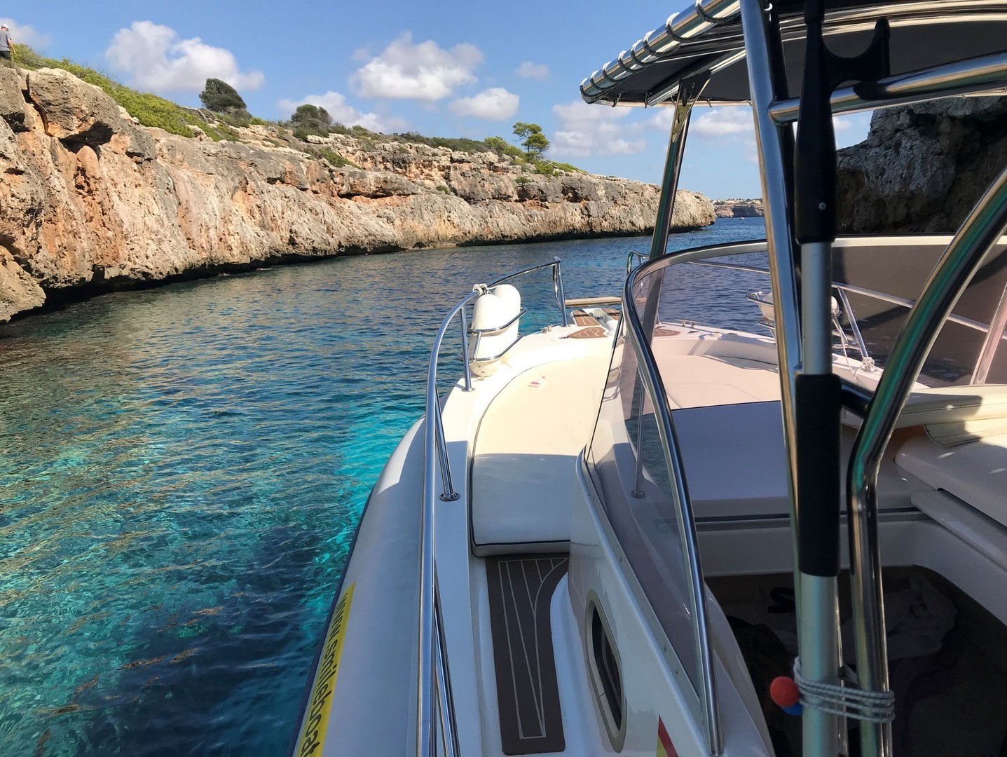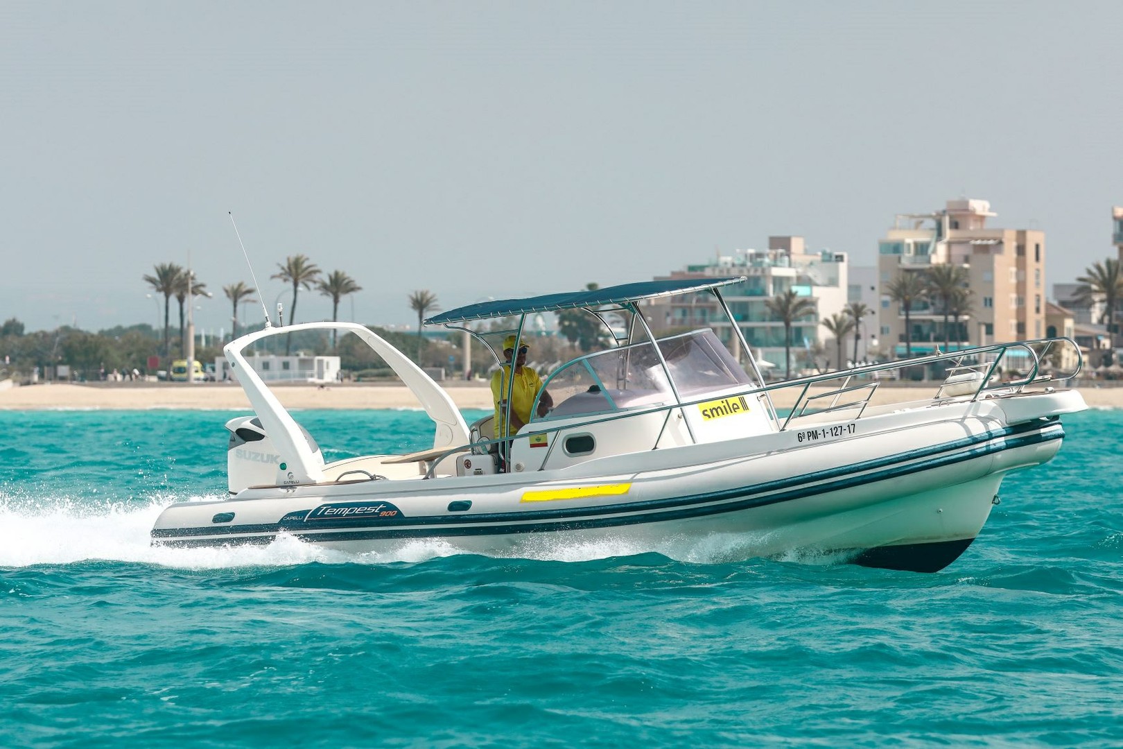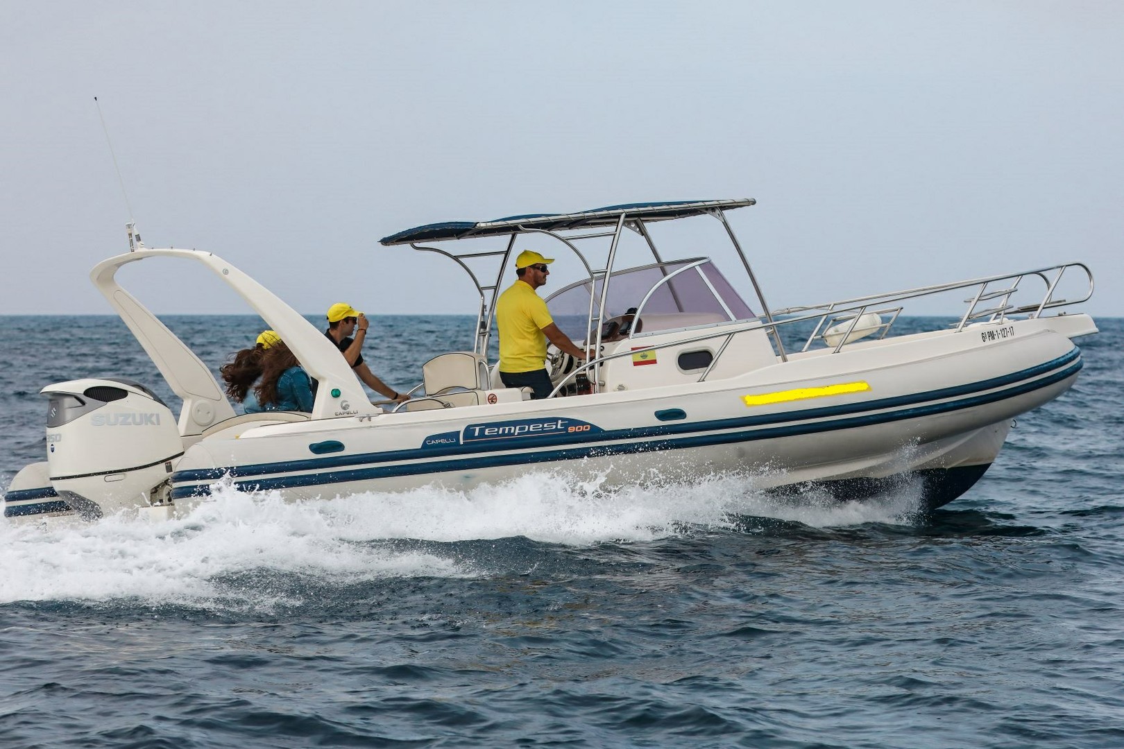 9 meters of pure pleasure, versatile, economical, and luxurious boat with YAMAHA 225cv 4 stroke engine, Capelli Tempest 900 WA is one of the best ribs on the market and surely the best in its length. It is equipped with a cabin, electric fridge, WC, electric anchor windlass, GPS sonar, awning, freshwater shower, table, refrigerator, stereo, and everything you need to spend a fantastic day on the boat. With a YAMAHA 225 hp 4-stroke engine, it is fast, quiet, and economical. It allows you to navigate at a cruising speed of 23 knots with a very tight consumption. Visit exclusive beaches only accessible by sea with this fantastic boat, enjoy snorkeling equipment (free of charge) or rent a wake, skis, or a towable to complete the fun. This boat will allow you to move around the south of the island with ease. Going to the islands of Dragonera and Cabrera will be within easy reach, as well as countless beaches and coves along the coast.