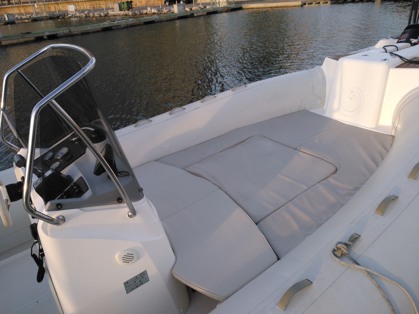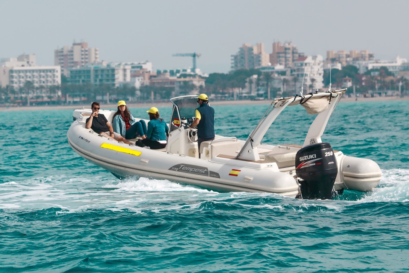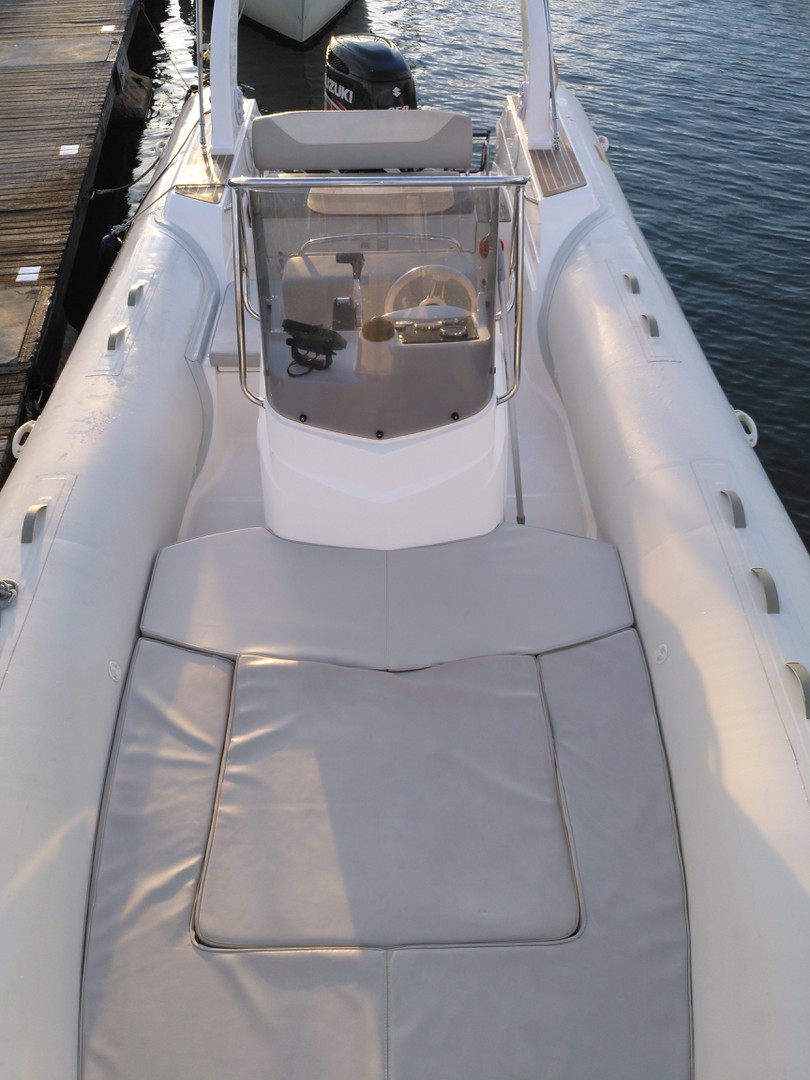 Fantástica semirrigida con gran solárium, ideal para un día de navegación. Rápida y confortable para que navegar sea un paseo. Dispone para su comodidad de molinete de ancla eléctrica, GPS sondar, toldo, ducha agua dulce, mesa, gran nevera de hielo, música, y todo lo necesario para pasar el día en el barco. Motor Suzuki 250 cv 4 tiempos rápido, silencioso y económico, permite navegar a una velocidad de crucero de 25 nudos con facilidad. Visite exclusivas playas desde el mar con esta fantástica semirrigida. Pídanos equipos para hacer snorkel (son gratuitos) o alquile un wake, skis o un arrastrable para disfrutar del día y visitar lugares como El Mago, Es Trenc, Cala Fornells, Portals Vells y todas nuestras maravillosas playas, que serán un placer para sus sentidos.